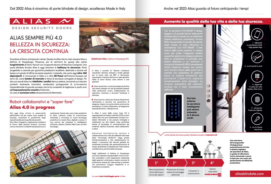 Come riportato dal quotidiano: “Guardare al futuro anticipando i tempi. Questa la sfida che ha visto nascere Alias a Settima di Gossolengo, Piacenza, più di vent’anni fa, grazie alla mente lungimirante di Dario Vaccari con il supporto tecnico di Maurizio Castignoli. Una porta blindata firmata Alias è oggi sinonimo di bellezza in sicurezza. Porte progettate e costruite per garantire prestazioni eccellenti, destinate a durare nel tempo e in grado di offrire sicurezza assoluta. L’azienda, che conta oggi oltre 160 dipendenti, è riconosciuta in Italia e in oltre 30 Paesi dell’Unione Europea ed extra UE, come leader di mercato in tema di sicurezza coniugata al design. Fin dai suoi esordi Alias ha ridefinito i confini del suo settore, lanciando sul mercato prodotti realmente innovativi, rendendosi protagonista di un’avventura imprenditoriale di grande successo che le ha consentito di registrare in pochi anni un’impressionante crescita di fatturato.
