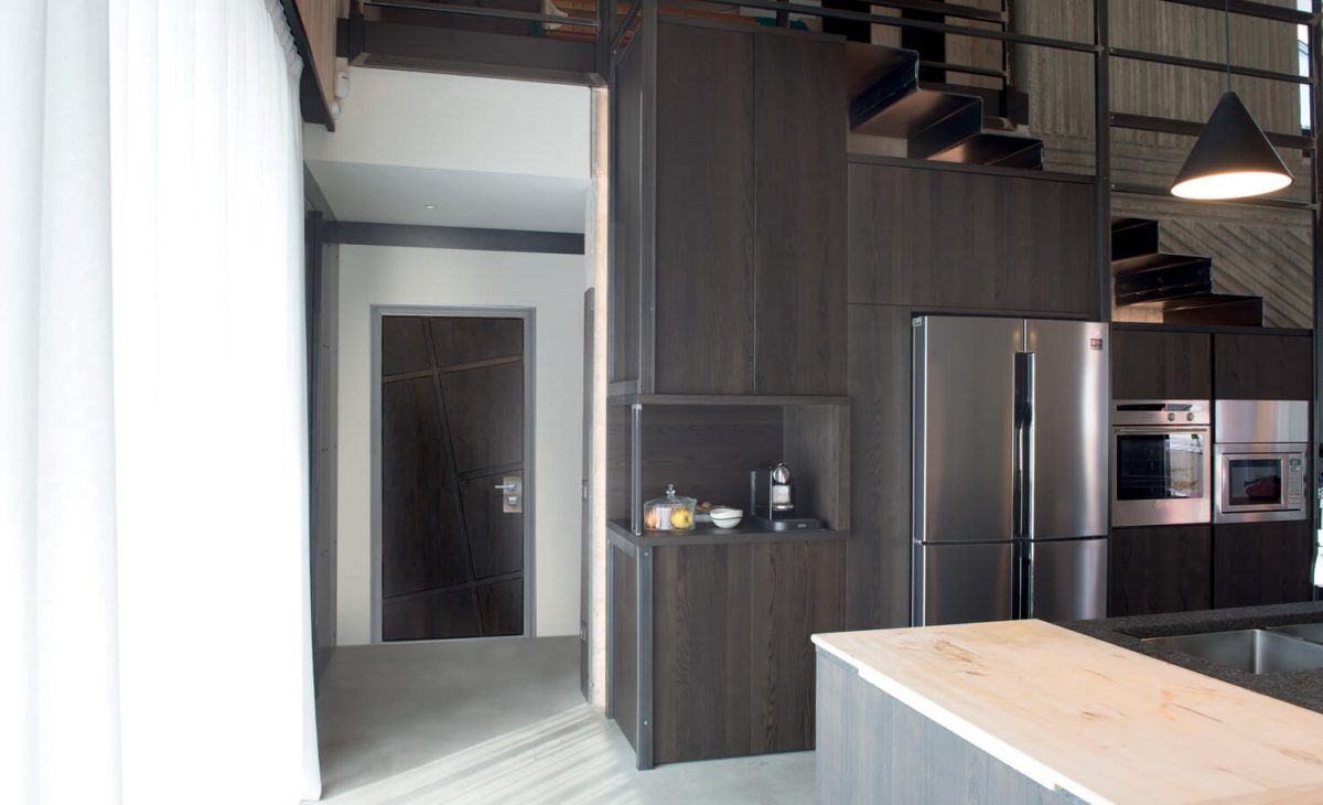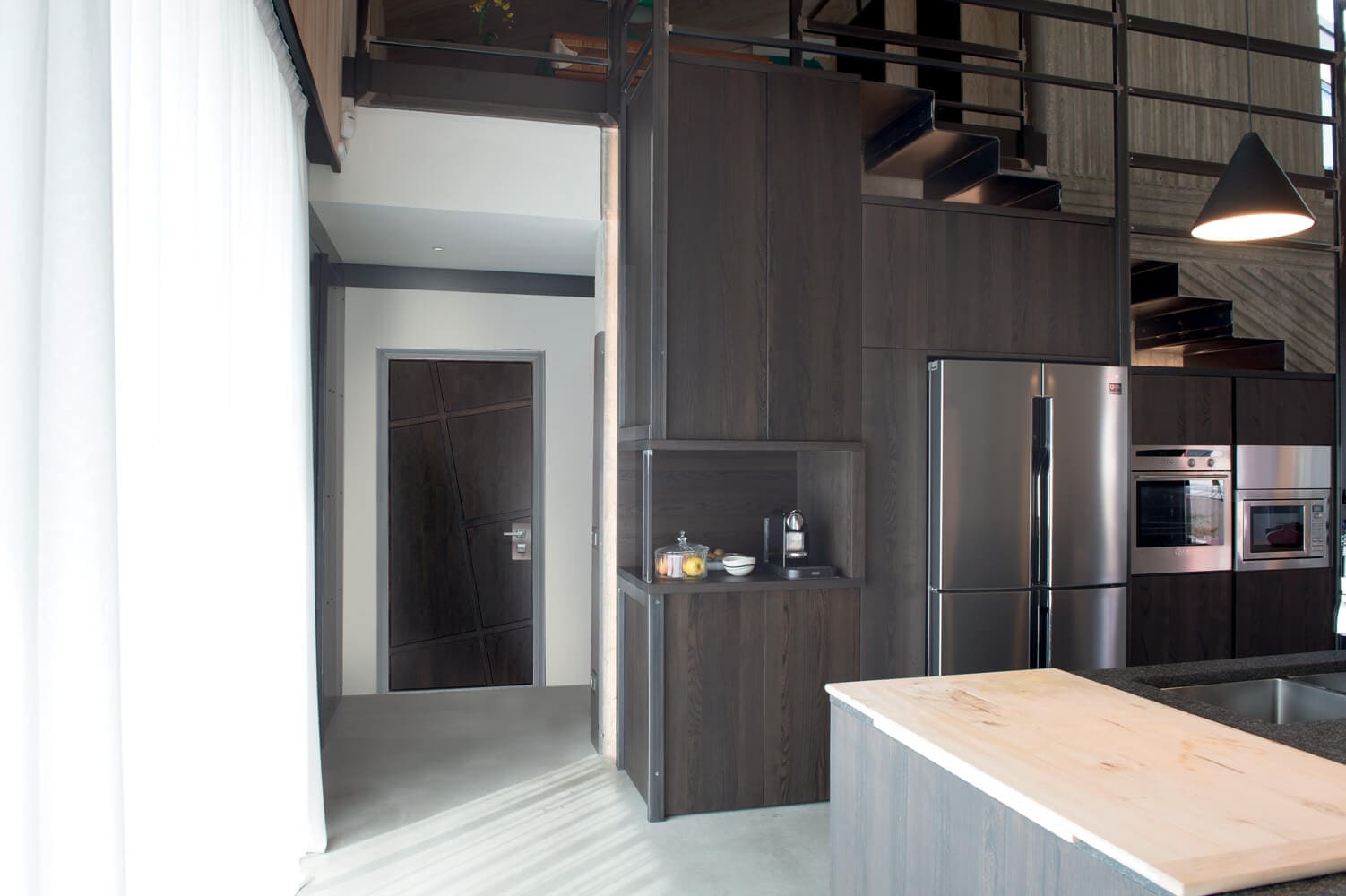 “CITY 3” model in grey oak is embellished with a stainless steel insert. The H4 square handle is in satin chrome.