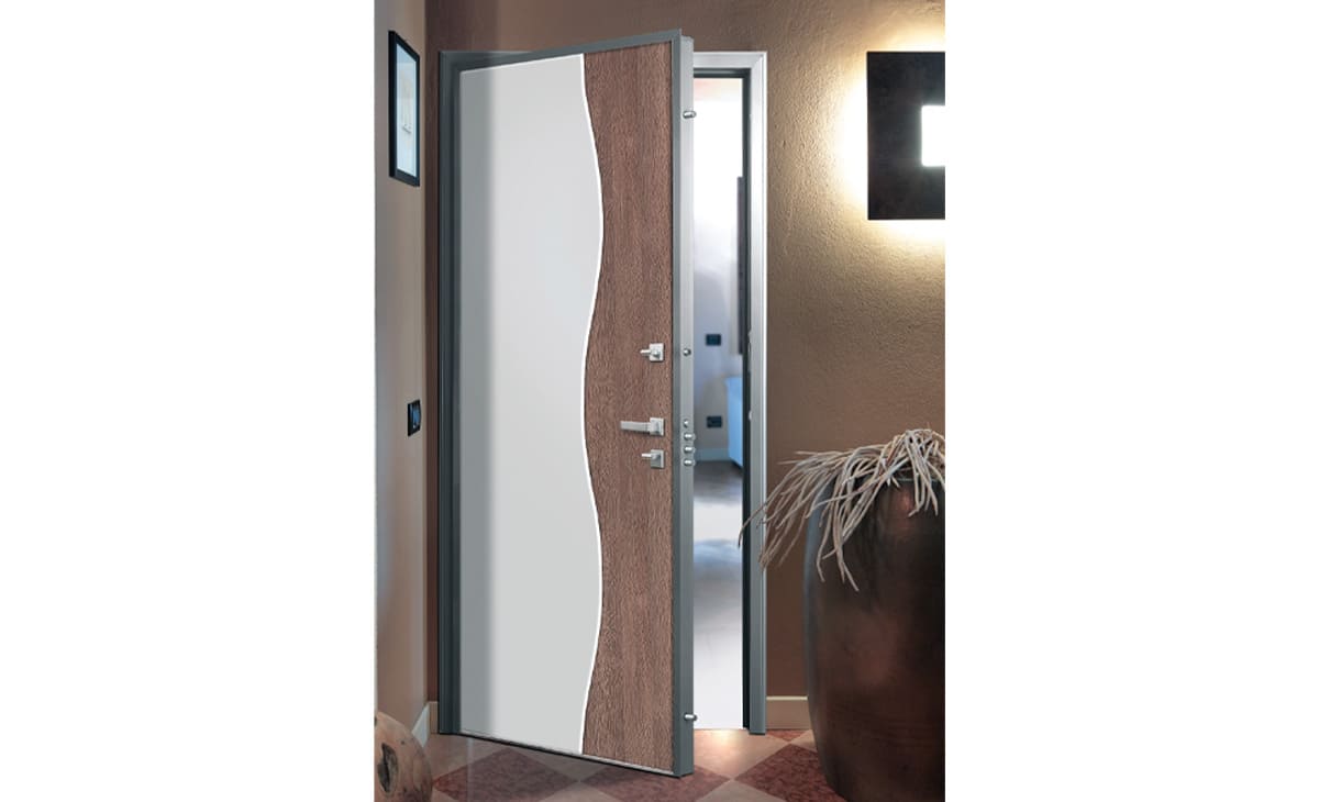 “Onda” panel with lacquered white RAL 9010 side hinge module and module side lock in laminated ground tranche. Squared H4 handle in satin chrome complete with a knob for coordinated locking device.