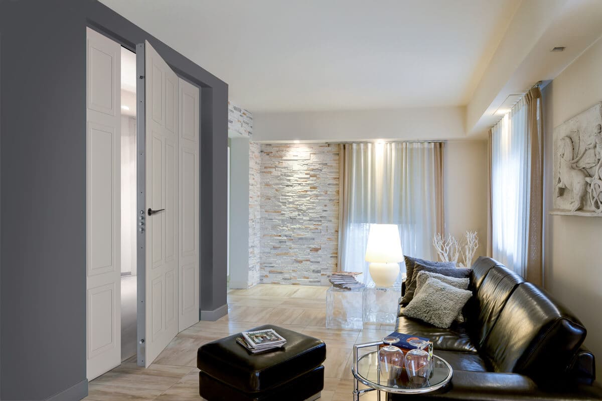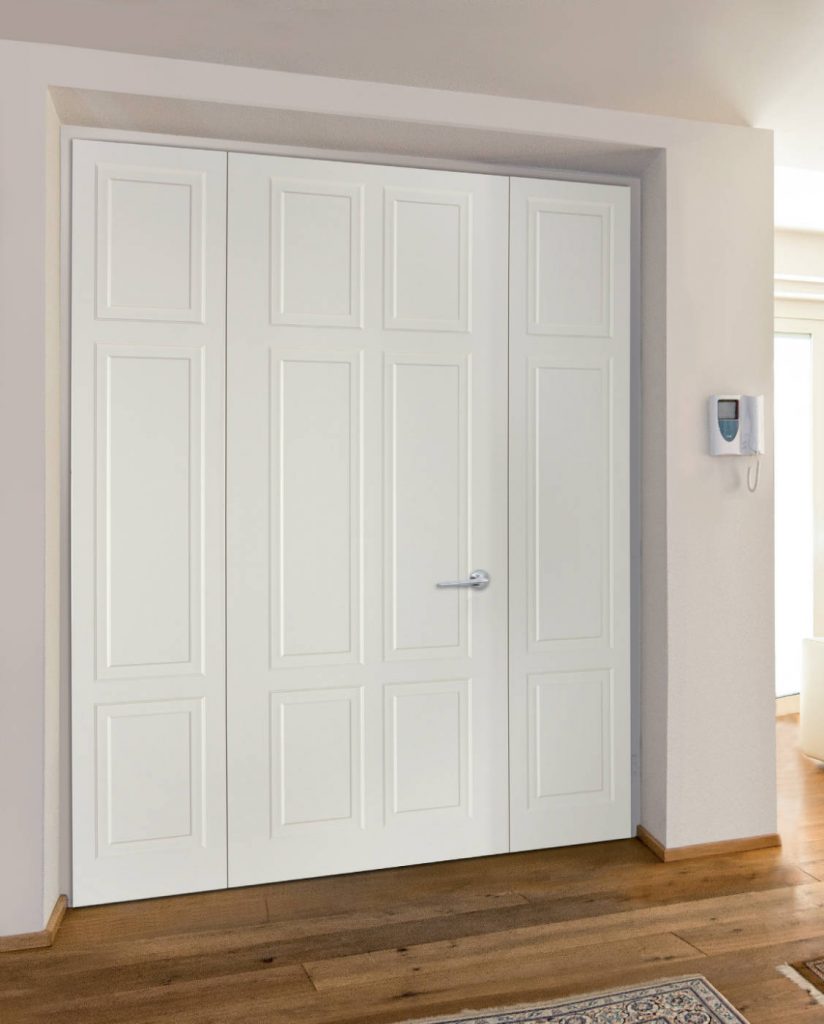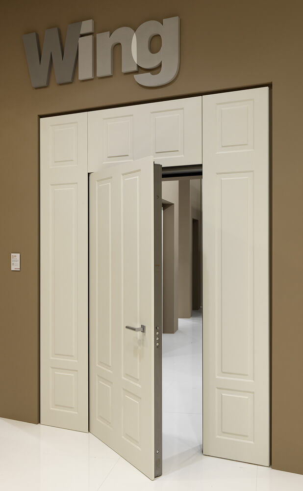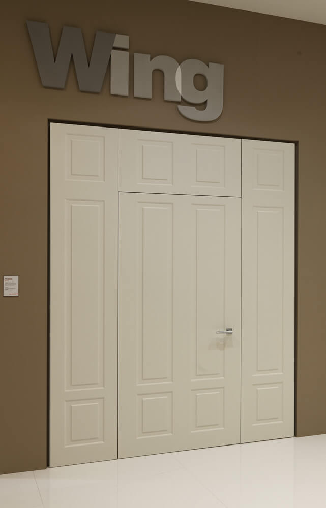 WING BOISERIE OLD ENGLAND is an elegant wall/door that expands the aesthetic of the door with wainscotting that is flush to it.