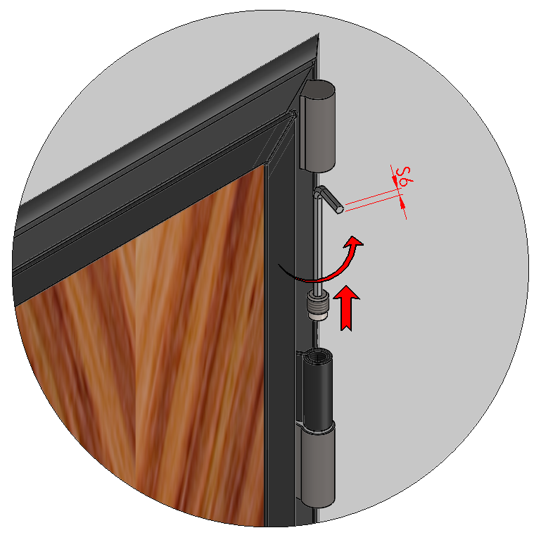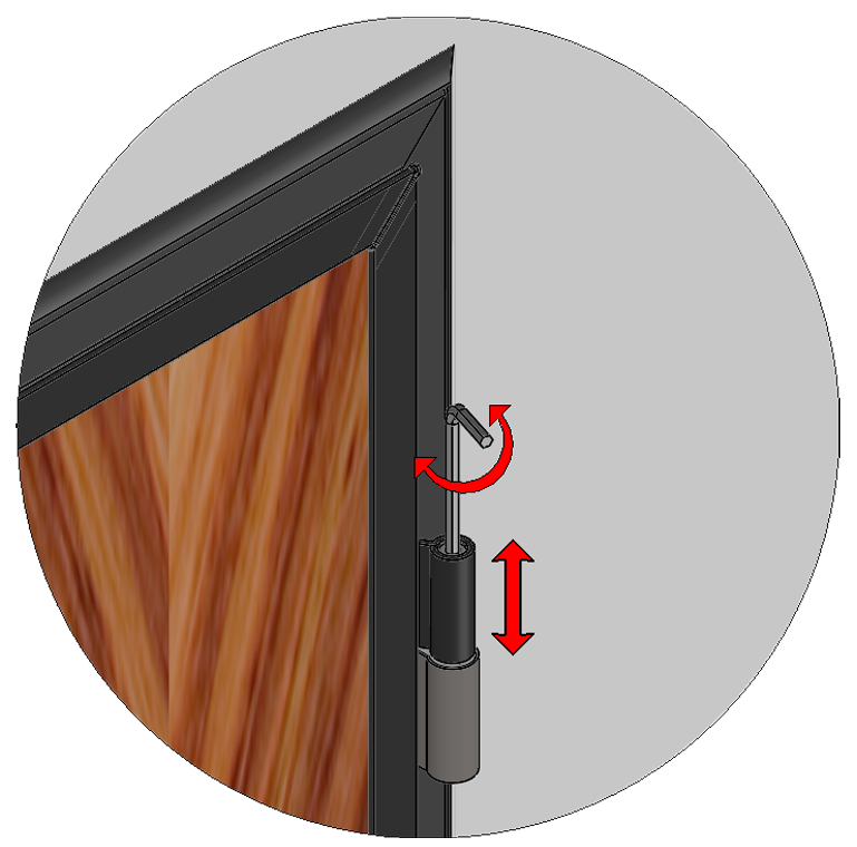 - Agire mediante la stessa chiave sulla cerniera superiore, ruotando in senso antiorario il perno di rotazione per abbassare il battente, viceversa per alzarlo.