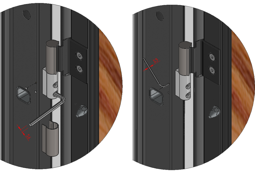 - Con una chiave a brugola da 3 mm, agire sui grani di regolazione all’interno del telaio, ruotandoli in senso orario per ridurre l’aria tra battente e telaio sul lato cerniere; viceversa in senso antiorario.
