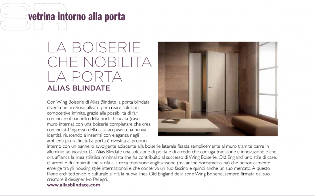 Ci trovate sul numero di febbraio/marzo di Showroom Porte&Finestre, la prima edizione del 2022. Alias è presente nella rubrica “Intorno alla Porta” a pagina 78 con la soluzioni per boiserie. L’interno numero della rivista è scaricabile in pdf da questo indirizzo: